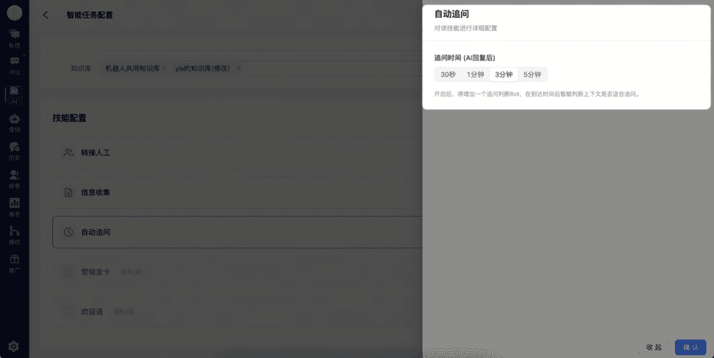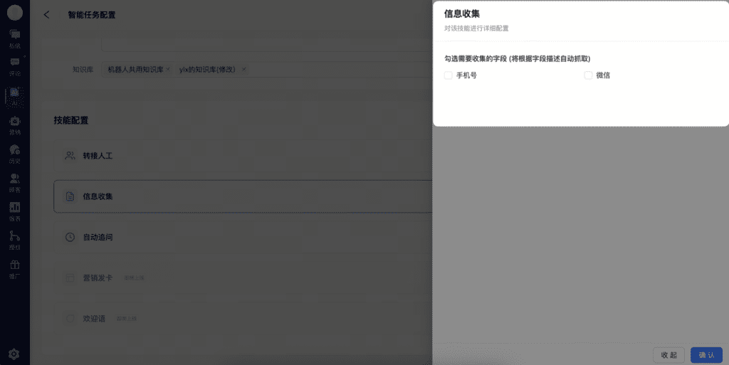 「智能任务」提供了5大AI技能,分别为转接人工、信息收集、自动追问、营销发卡与欢迎语。