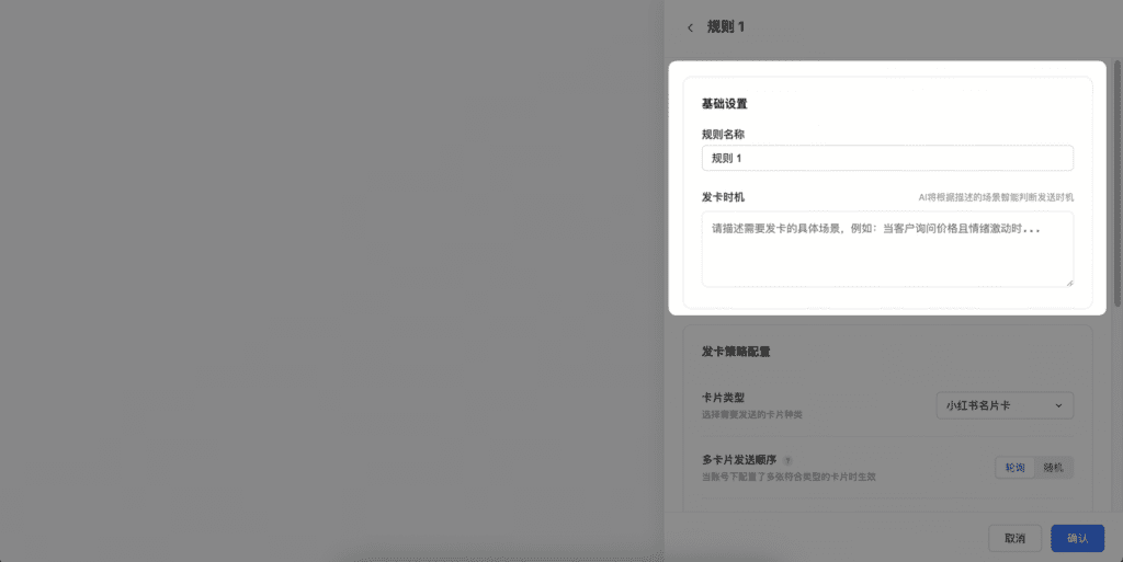 进入设置页面,编辑规则名称和发卡时机(用自然语言描述即可,AI大模型会主动识别),建议描述清晰,如“用户明确询问价格”、“用户主动索要客服联系方式”等。