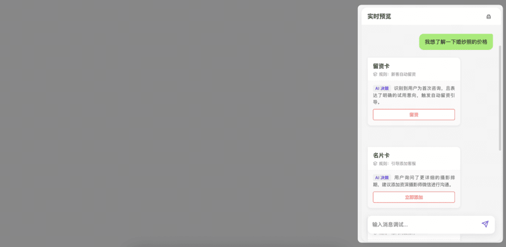 在对话过程中,AI会按照设置的营销发卡规则自动发送营销卡片(如名片卡、留资卡等),有效促进留资转化。