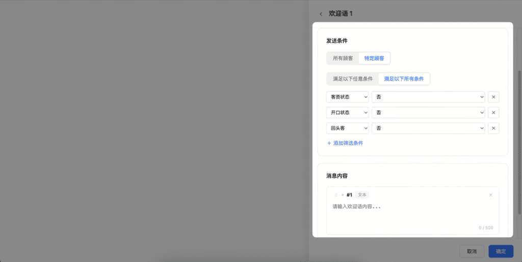 进入欢迎语设置页面,可以自定义发送条件与内容,欢迎语支持 文本/图片两种类型,总共支持配置2条消息。