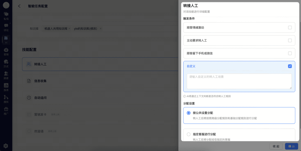 触发条件:勾选需要人工介入的场景,比如顾客情绪激动、主动要求转人工、顾客已留资等常见情况